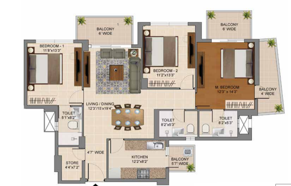 3 BHK + 3T + STORE (WITH EXTRA BALCONY)