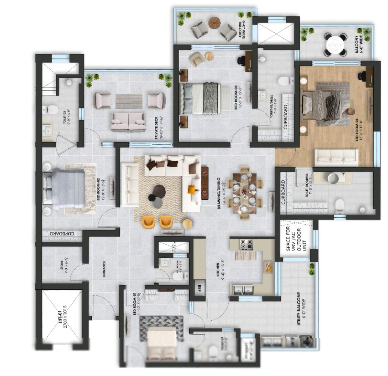 All flats include energy-efficient VRV air-conditioning systems for year-round comfort.